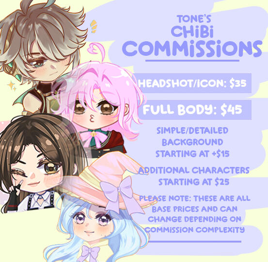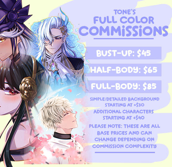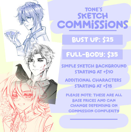 • Commissions are for PERSONAL USE only. IF you have commercial use intentions, please let me know as there will be a commercial license fee added to the overall total.• Please provide as many references as you can! If you only have a text description, please be as detailed as possible.• I have the right to refuse any potential commission for any reason.• WIPS/progress checks can be given with request.• Specific deadlines should be mentioned in the inquiry.• Payment is required to be paid in full before the start of the sketch. However, I do allow for partial 2 payments for larger commission requests.• Once the work is started and payment is done, no refund is available.• I do not draw furry, mecha, explicit nsfw. I can do some mild nsfw but must be discussed prior.• Paying means you have agreed to these Terms and Conditions.